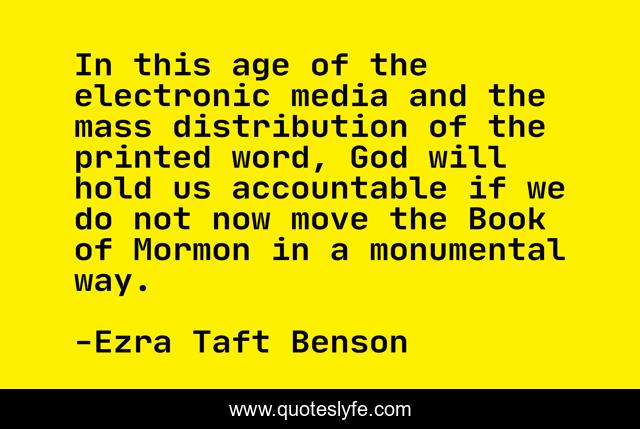 This page presents the quote "In this age of the electronic media and the mass distribution of the printed word, God will hold us accountable if we do not now move the Book of Mormon in a monumental way.". Author of this quote is Ezra Taft Benson. This quote is about god, book, media,.