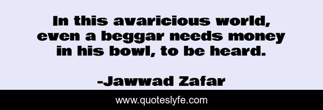This page presents the quote "In this avaricious world, even a beggar needs money in his bowl, to be heard.". Author of this quote is Jawwad Zafar. This quote is about beggar, people, money, begging, greedy, world, coin, corruption, greed,.