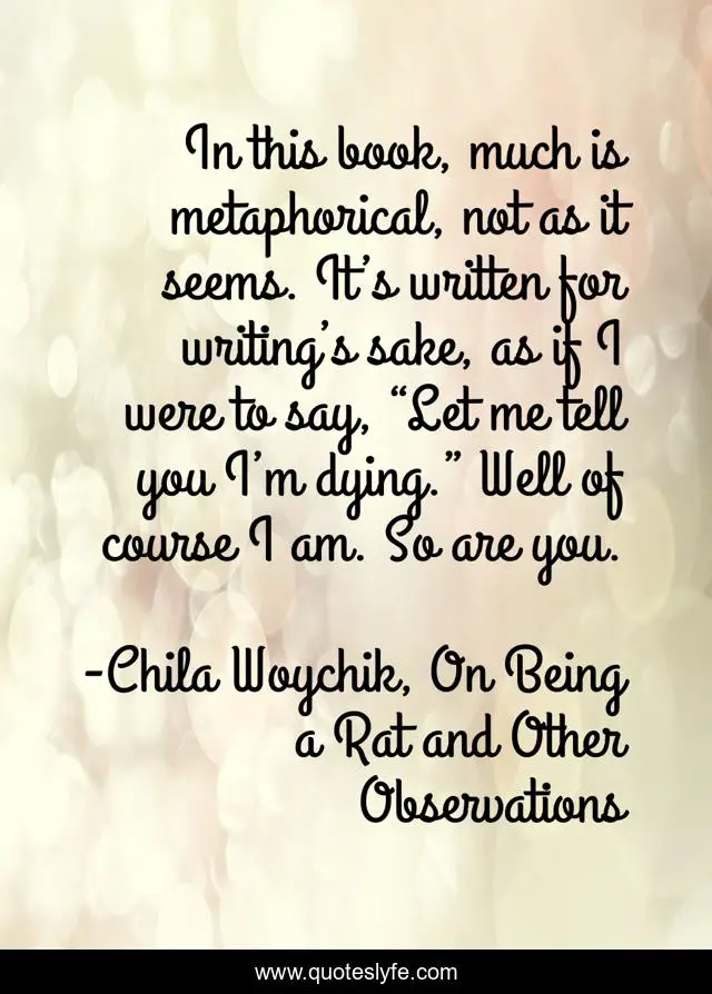 This page presents the quote "In this book, much is metaphorical, not as it seems. It’s written for writing’s sake, as if I were to say, “Let me tell you I’m dying.” Well of course I am. So are you.". Author of this quote is Chila Woychik, On Being a Rat and Other Observations. This quote is about writing-process, metaphors, writing,.
