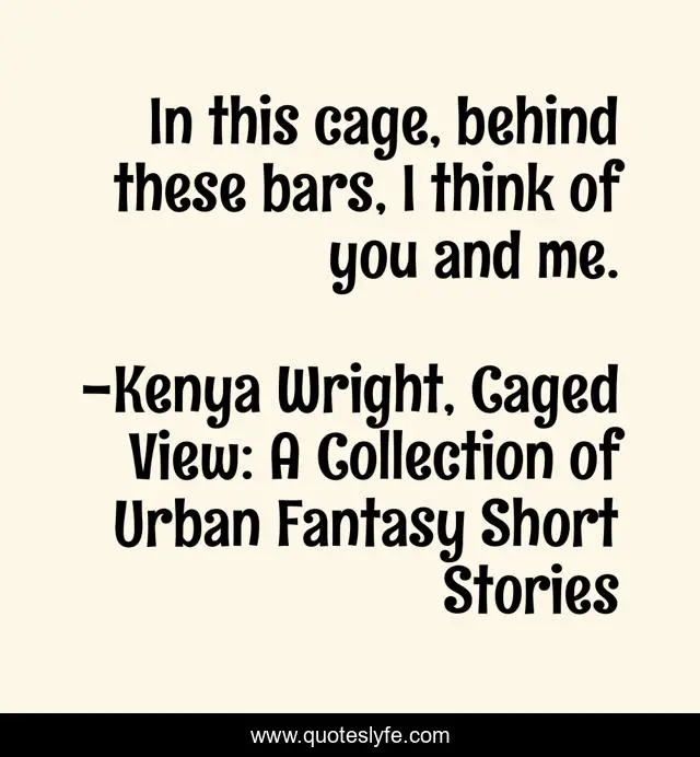 This page presents the quote "In this cage, behind these bars, I think of you and me.". Author of this quote is Kenya Wright, Caged View: A Collection of Urban Fantasy Short Stories. This quote is about lanore, paranormal-romance, zulu,.