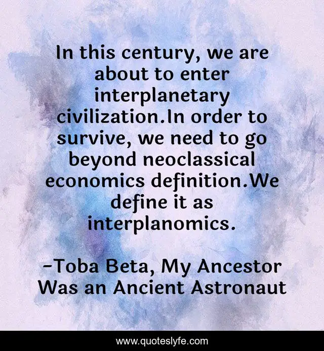 This page presents the quote "In this century, we are about to enter interplanetary civilization.In order to survive, we need to go beyond neoclassical economics definition.We define it as interplanomics.". Author of this quote is Toba Beta, My Ancestor Was an Ancient Astronaut. This quote is about interplanomics, economics, interplanetary,.