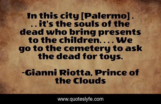 This page presents the quote "In this city [Palermo] . . . it's the souls of the dead who bring presents to the children. . . . We go to the cemetery to ask the dead for toys.". Author of this quote is Gianni Riotta, Prince of the Clouds. .