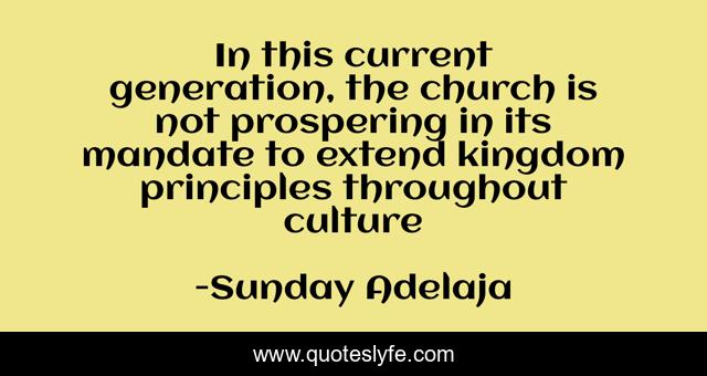 This page presents the quote "In this current generation, the church is not prospering in its mandate to extend kingdom principles throughout culture". Author of this quote is Sunday Adelaja. This quote is about current, generation, church,.