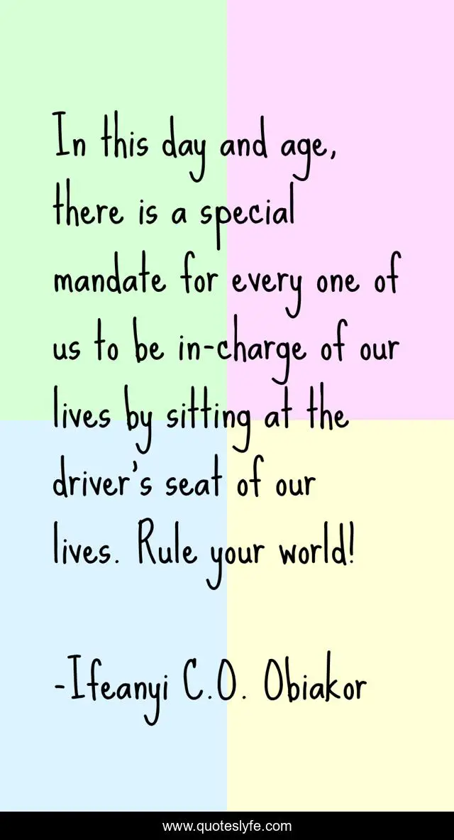 This page presents the quote "In this day and age, there is a special mandate for every one of us to be in-charge of our lives by sitting at the driver's seat of our lives. Rule your world!". Author of this quote is Ifeanyi C.O. Obiakor. This quote is about age, passion, inspirational, world, enthusiasm, vision,.