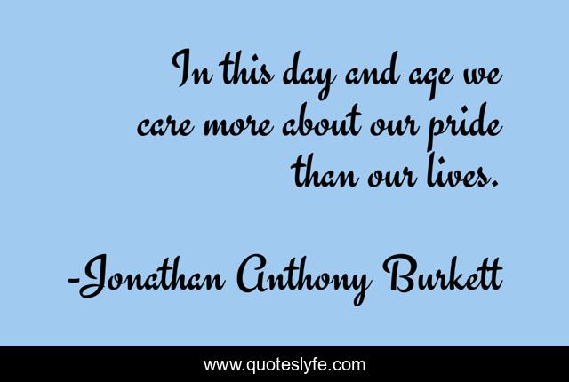 This page presents the quote "In this day and age we care more about our pride than our lives.". Author of this quote is Jonathan Anthony Burkett. This quote is about 2016, life, truth-of-life, money, quotes, truth, quotes-about-life, pride, decisions,.