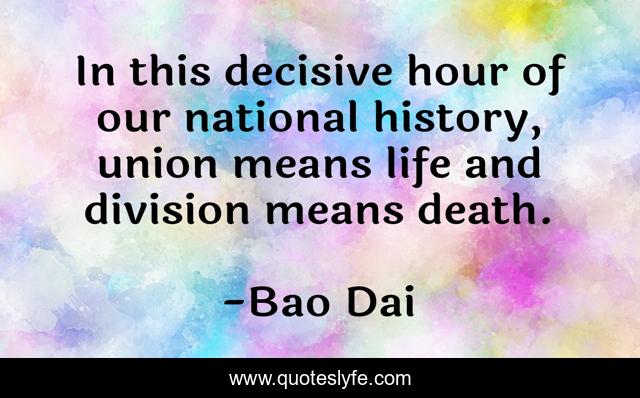 This page presents the quote "In this decisive hour of our national history, union means life and division means death.". Author of this quote is Bao Dai. This quote is about division, life, history,.