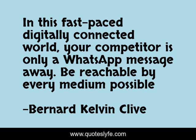This page presents the quote "In this fast-paced digitally connected world, your competitor is only a WhatsApp message away. Be reachable by every medium possible". Author of this quote is Bernard Kelvin Clive. This quote is about social-media, digital-marketing, customer-service, branding, customer-relations, connection-economy,.