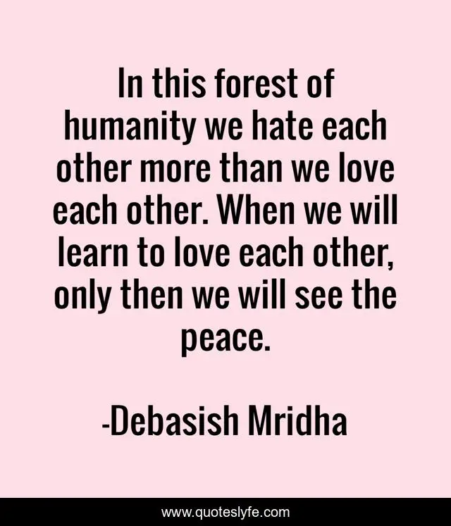 This page presents the quote "In this forest of humanity we hate each other more than we love each other. When we will learn to love each other, only then we will see the peace.". Author of this quote is Debasish Mridha. This quote is about life, love, knowledge, inspirational, intelligence, philosophy, wisdom, quotes, affection,.