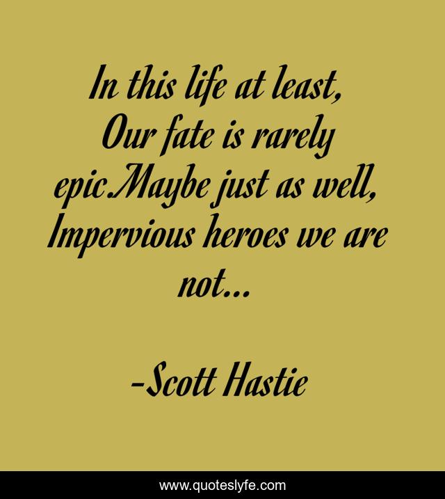 This page presents the quote "In this life at least, Our fate is rarely epic.Maybe just as well, Impervious heroes we are not…". Author of this quote is Scott Hastie. This quote is about life, epic, impervious, fate, fate-destiny, poetry, wisdom, poetry-life, heroes,.