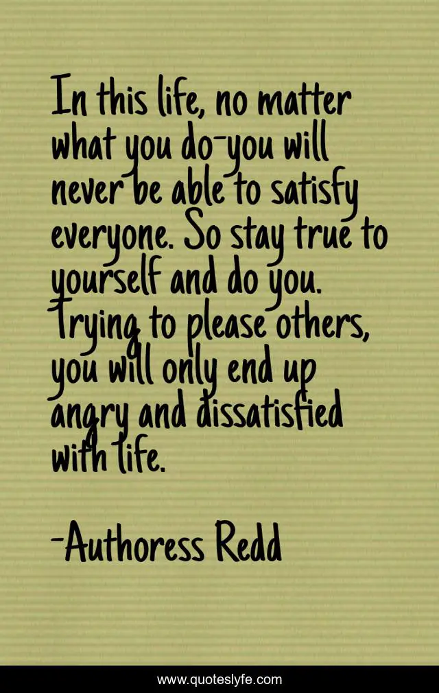 This page presents the quote "In this life, no matter what you do-you will never be able to satisfy everyone. So stay true to yourself and do you. Trying to please others, you will only end up angry and dissatisfied with life.". Author of this quote is Authoress Redd. This quote is about gossip, enemies, happiness-positive-outlook, self-worth,.