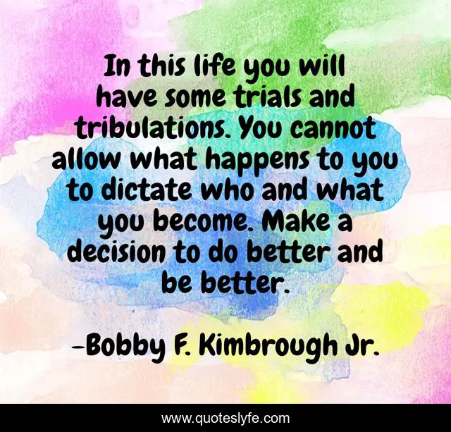 This page presents the quote "In this life you will have some trials and tribulations. You cannot allow what happens to you to dictate who and what you become. Make a decision to do better and be better.". Author of this quote is Bobby F. Kimbrough Jr.. This quote is about motivation, strength, god, survival, midnight, spiritual, existence,.