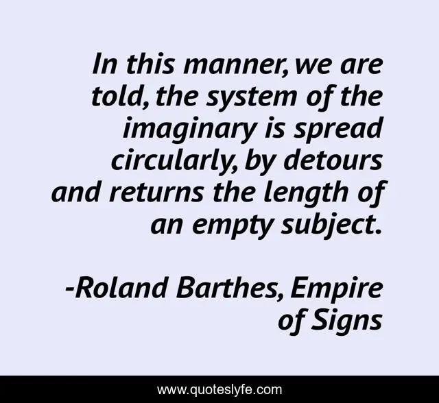 "Roland Barthes, Empire of Signs Quotes." Quoteslyfe.com, 2025. Fri. 05 Dec. 2025. <https://www.quoteslyfe.com/quote/In-this-manner-we-are-told-the-125904>.