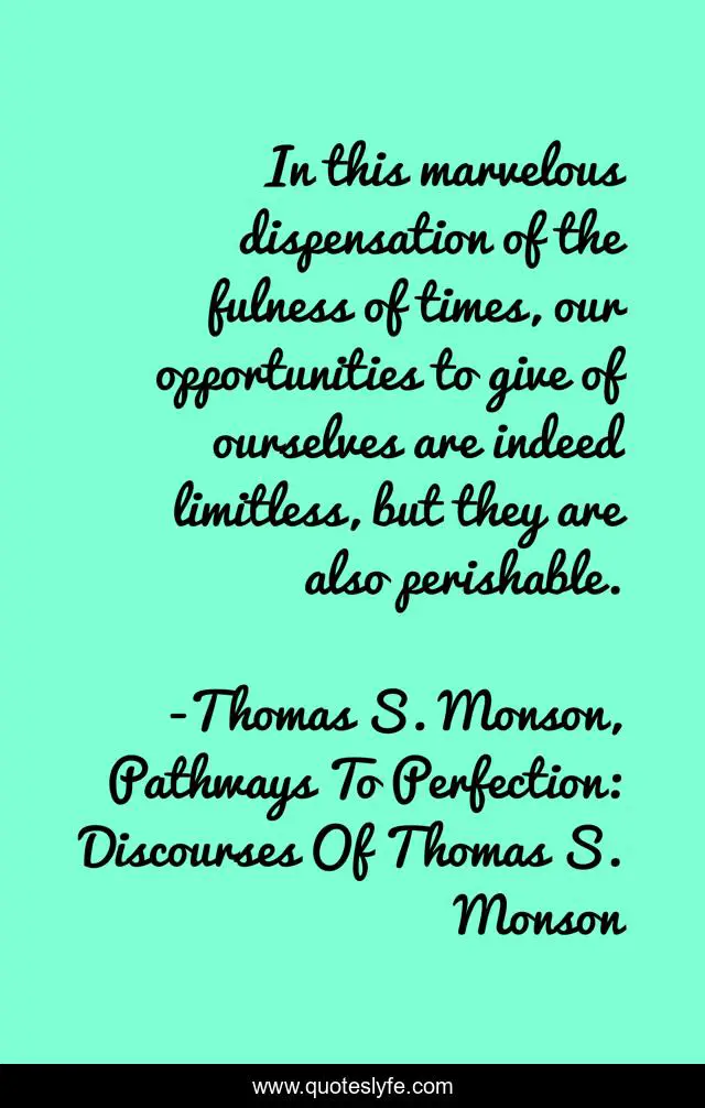 This page presents the quote "In this marvelous dispensation of the fulness of times, our opportunities to give of ourselves are indeed limitless, but they are also perishable.". Author of this quote is Thomas S. Monson, Pathways To Perfection: Discourses Of Thomas S. Monson. This quote is about opportunities, service, time,.