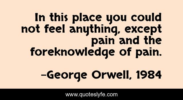This page presents the quote "In this place you could not feel anything, except pain and the foreknowledge of pain.". Author of this quote is George Orwell, 1984. This quote is about 1984, pain,.