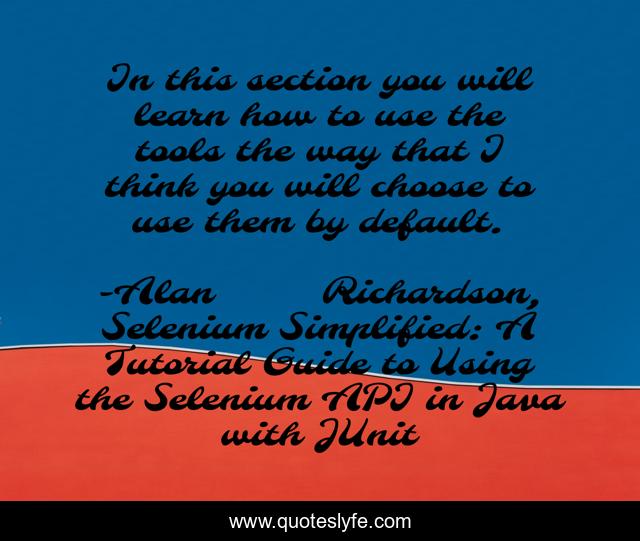 This page presents the quote "In this section you will learn how to use the tools the way that I think you will choose to use them by default.". Author of this quote is Alan Richardson, Selenium Simplified: A Tutorial Guide to Using the Selenium API in Java with JUnit. This quote is about humor, technology, 2012,.