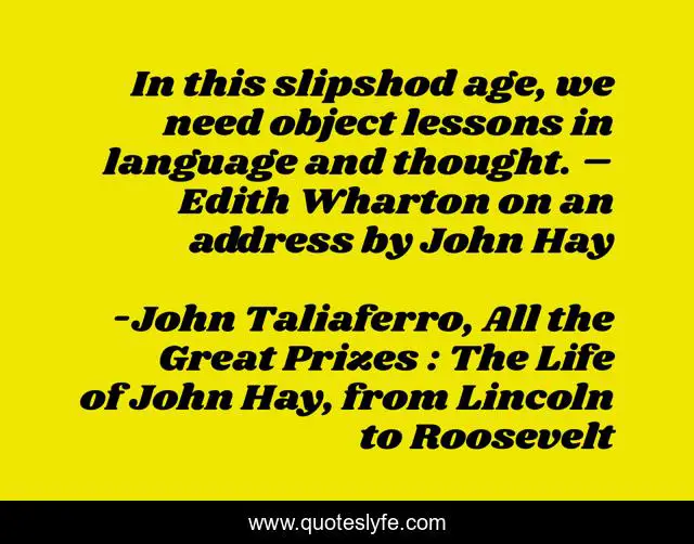 This page presents the quote "In this slipshod age, we need object lessons in language and thought. – Edith Wharton on an address by John Hay". Author of this quote is John Taliaferro, All the Great Prizes : The Life of John Hay, from Lincoln to Roosevelt. This quote is about communication, tact, statesmanship-i,.
