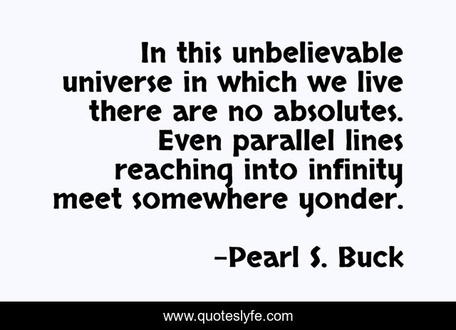 This page presents the quote "In this unbelievable universe in which we live there are no absolutes. Even parallel lines reaching into infinity meet somewhere yonder.". Author of this quote is Pearl S. Buck. .