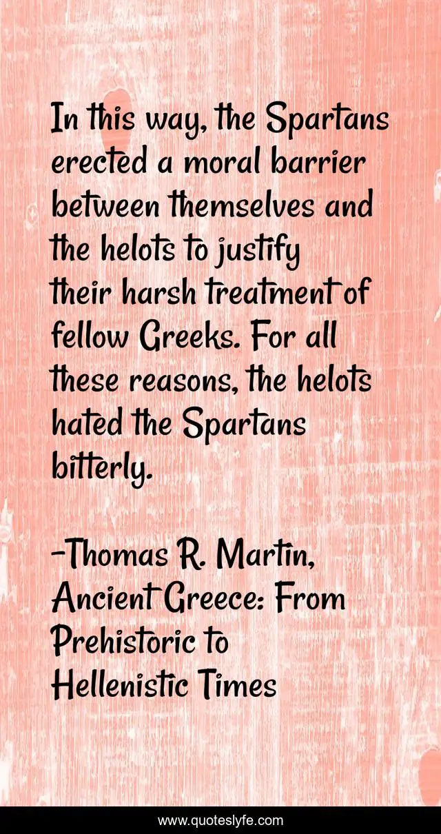 This page presents the quote "In this way, the Spartans erected a moral barrier between themselves and the helots to justify their harsh treatment of fellow Greeks. For all these reasons, the helots hated the Spartans bitterly.". Author of this quote is Thomas R. Martin, Ancient Greece: From Prehistoric to Hellenistic Times. This quote is about greece, slavery, sparta,.