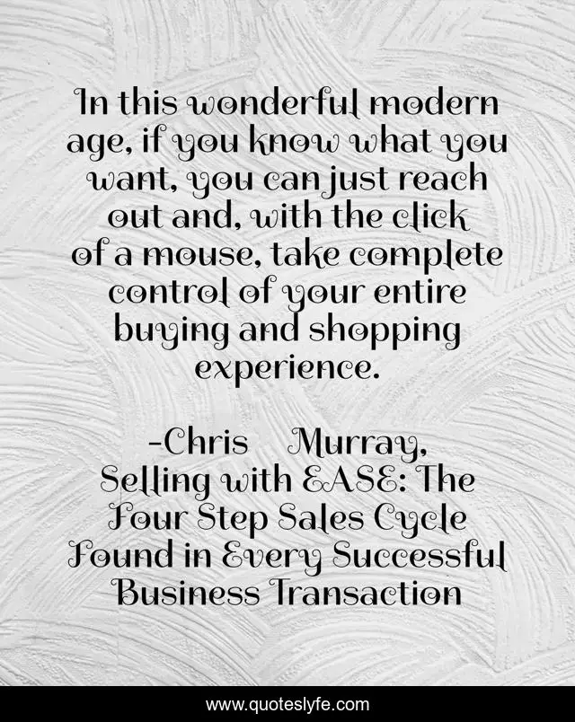 This page presents the quote "In this wonderful modern age, if you know what you want, you can just reach out and, with the click of a mouse, take complete control of your entire buying and shopping experience.". Author of this quote is Chris Murray, Selling with EASE: The Four Step Sales Cycle Found in Every Successful Business Transaction. This quote is about business-success, negotiation, customers, selling, business-advice, sales-training, business, money, influence,.