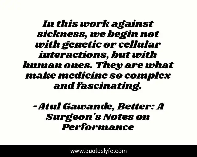 "Atul Gawande, Better: A Surgeon's Notes on Performance Quotes." Quoteslyfe.com, 2025. Sat. 06 Dec. 2025. <https://www.quoteslyfe.com/quote/In-this-work-against-sickness-we-begin-243196>.