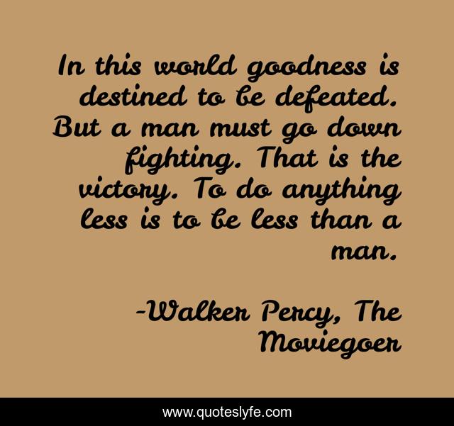 This page presents the quote "In this world goodness is destined to be defeated. But a man must go down fighting. That is the victory. To do anything less is to be less than a man.". Author of this quote is Walker Percy, The Moviegoer. This quote is about goodness, man,.