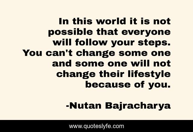 This page presents the quote "In this world it is not possible that everyone will follow your steps. You can't change some one and some one will not change their lifestyle because of you.". Author of this quote is Nutan Bajracharya. This quote is about we, friend, lifestyle, life, value, relation, us, human, love,.