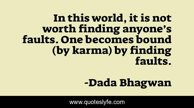This page presents the quote "In this world, it is not worth finding anyone’s faults. One becomes bound (by karma) by finding faults.". Author of this quote is Dada Bhagwan. This quote is about fault, spiritual, ego, karma, faults,.