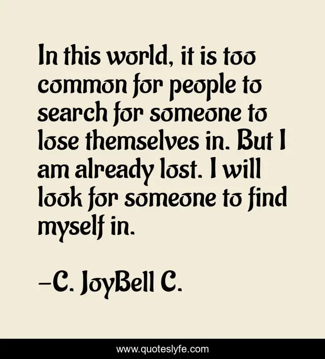 This page presents the quote "In this world, it is too common for people to search for someone to lose themselves in. But I am already lost. I will look for someone to find myself in.". Author of this quote is C. JoyBell C.. This quote is about inspiring, lovers, love, searching-and-finding, lost, inspirational-love, inspirational-life, affection,.