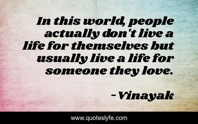 This page presents the quote "In this world, people actually don't live a life for themselves but usually live a life for someone they love.". Author of this quote is Vinayak. This quote is about life, love, affection, inspiration,.