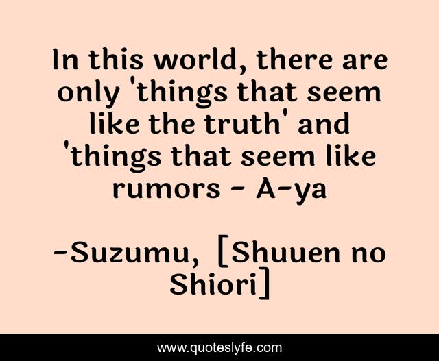This page presents the quote "In this world, there are only 'things that seem like the truth' and 'things that seem like rumors - A-ya". Author of this quote is Suzumu, 終焉の栞 [Shuuen no Shiori]. This quote is about mystery, school, horror, aya, light-novel, shuuen-no-shiori, suzumu, supernatural, manga,.