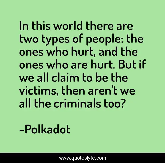 This page presents the quote "In this world there are two types of people: the ones who hurt, and the ones who are hurt. But if we all claim to be the victims, then aren't we all the criminals too?". Author of this quote is Polkadot. This quote is about relationships, life, novel, love, science, fiction, romance, heartbreak, inspirational,.