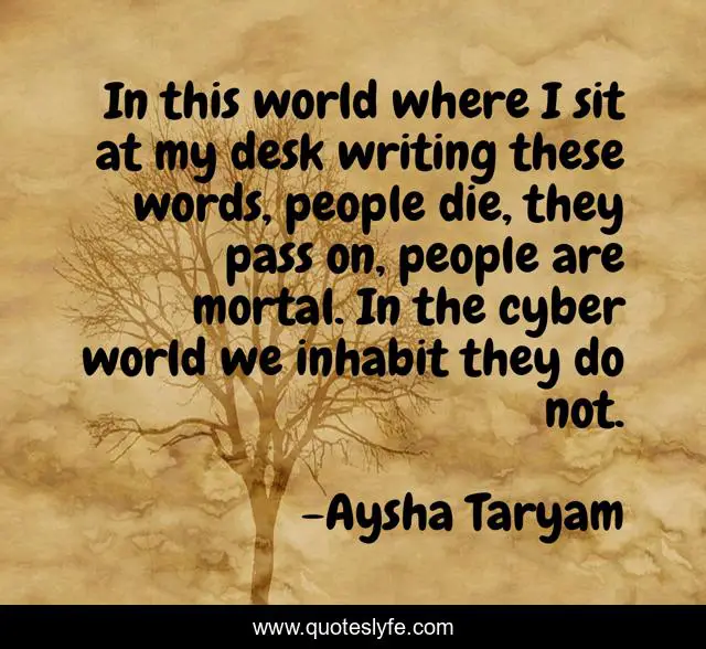 This page presents the quote "In this world where I sit at my desk writing these words, people die, they pass on, people are mortal. In the cyber world we inhabit they do not.". Author of this quote is Aysha Taryam. This quote is about death, cyber, immortal, cyber-world, immortality, legacy, identity, internet, writing,.