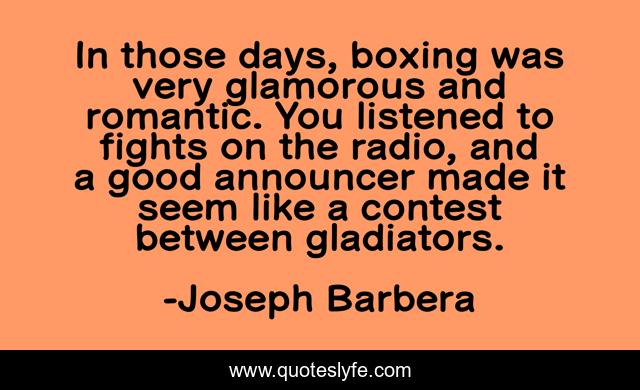 This page presents the quote "In those days, boxing was very glamorous and romantic. You listened to fights on the radio, and a good announcer made it seem like a contest between gladiators.". Author of this quote is Joseph Barbera. This quote is about good, boxing,.