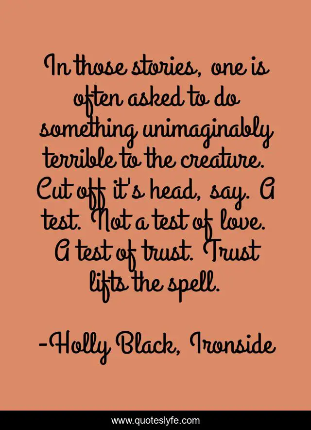 This page presents the quote "In those stories, one is often asked to do something unimaginably terrible to the creature. Cut off it's head, say. A test. Not a test of love. A test of trust. Trust lifts the spell.". Author of this quote is Holly Black, Ironside. This quote is about faerie, trust, love, affection, roiben,.