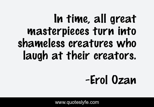 This page presents the quote "In time, all great masterpieces turn into shameless creatures who laugh at their creators.". Author of this quote is Erol Ozan. This quote is about artistry, art, work-of-art, creation, antiquity, mona-lisa, great-works-of-art, creatures, museum,.