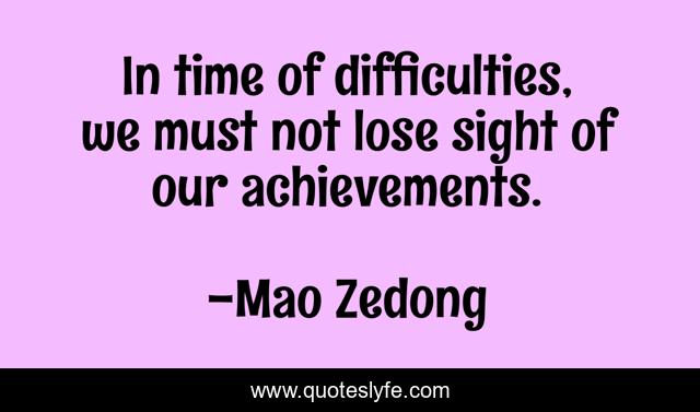 This page presents the quote "In time of difficulties, we must not lose sight of our achievements.". Author of this quote is Mao Zedong. This quote is about difficulties, sight, lose,.
