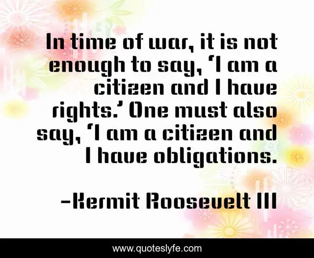 This page presents the quote "In time of war, it is not enough to say, ‘I am a citizen and I have rights.’ One must also say, ‘I am a citizen and I have obligations.". Author of this quote is Kermit Roosevelt III. .