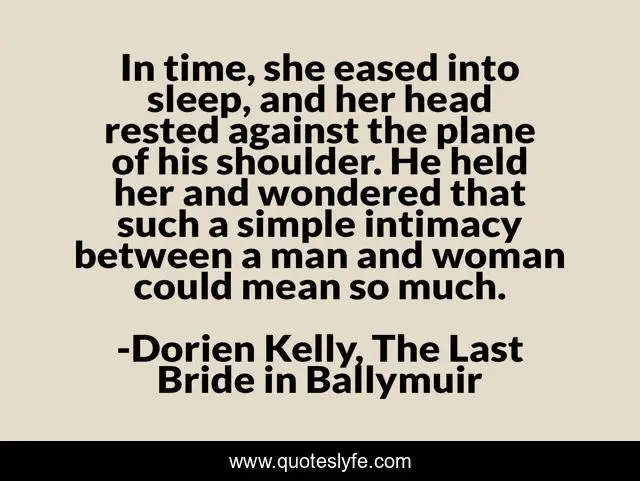 This page presents the quote "In time, she eased into sleep, and her head rested against the plane of his shoulder. He held her and wondered that such a simple intimacy between a man and woman could mean so much.". Author of this quote is Dorien Kelly, The Last Bride in Ballymuir. This quote is about sweetheart, cherishing, love, romantic, affection,.