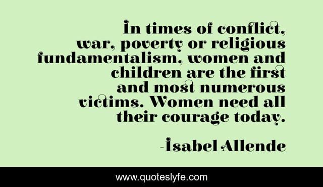 This page presents the quote "In times of conflict, war, poverty or religious fundamentalism, women and children are the first and most numerous victims. Women need all their courage today.". Author of this quote is Isabel Allende. This quote is about children, today, women,.
