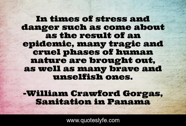 This page presents the quote "In times of stress and danger such as come about as the result of an epidemic, many tragic and cruel phases of human nature are brought out, as well as many brave and unselfish ones.". Author of this quote is William Crawford Gorgas, Sanitation in Panama. This quote is about human-behavior, sanitation, infectious-diseases, danger, epidemics, disease-control, public-health, yellow-fever, ebola,.