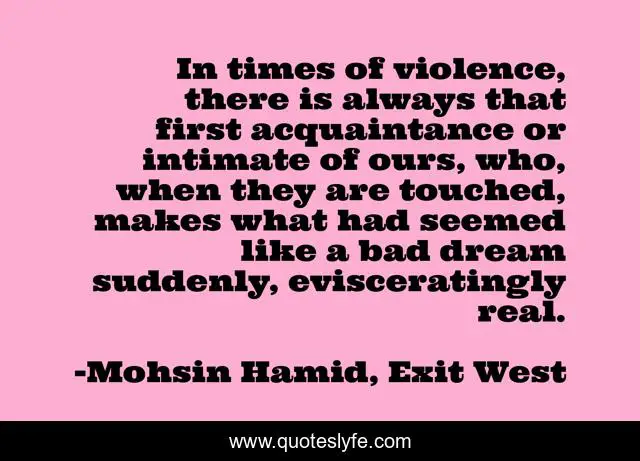 This page presents the quote "In times of violence, there is always that first acquaintance or intimate of ours, who, when they are touched, makes what had seemed like a bad dream suddenly, evisceratingly real.". Author of this quote is Mohsin Hamid, Exit West. .