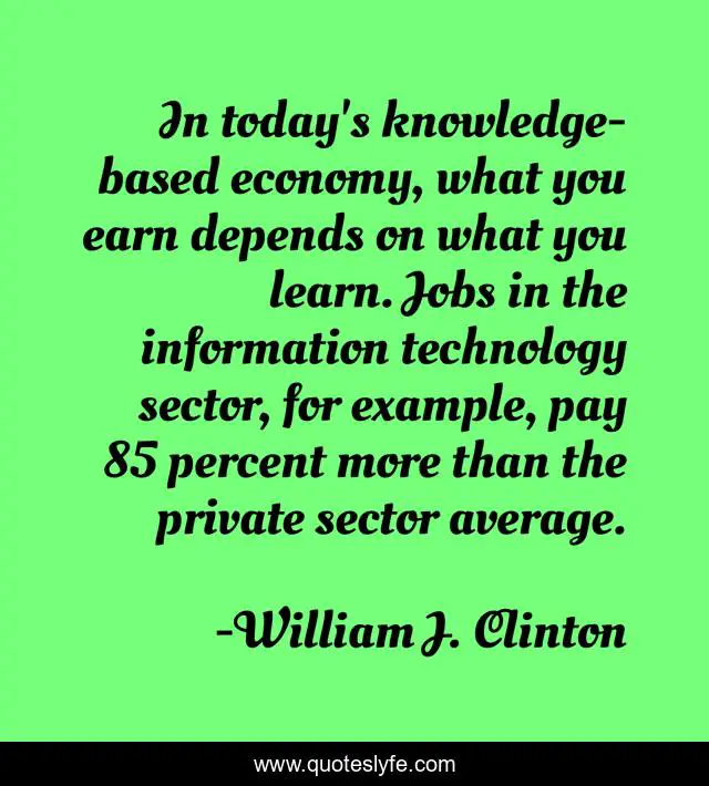 This page presents the quote "In today's knowledge-based economy, what you earn depends on what you learn. Jobs in the information technology sector, for example, pay 85 percent more than the private sector average.". Author of this quote is William J. Clinton. This quote is about information, today,.
