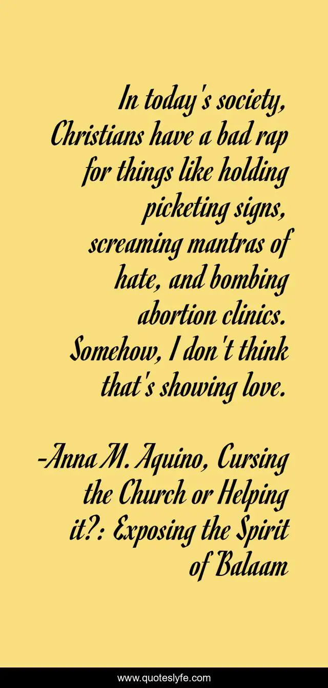 This page presents the quote "In today's society, Christians have a bad rap for things like holding picketing signs, screaming mantras of hate, and bombing abortion clinics. Somehow, I don't think that's showing love.". Author of this quote is Anna M. Aquino, Cursing the Church or Helping it?: Exposing the Spirit of Balaam. This quote is about faith, bible, cursing-the-church-or-helping-it, unity, balaam, church,.