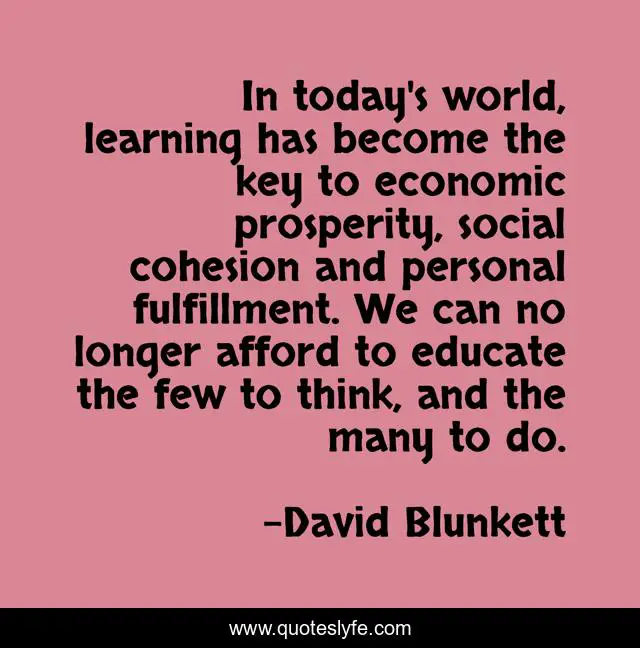 This page presents the quote "In today's world, learning has become the key to economic prosperity, social cohesion and personal fulfillment. We can no longer afford to educate the few to think, and the many to do.". Author of this quote is David Blunkett. This quote is about world, think, today,.