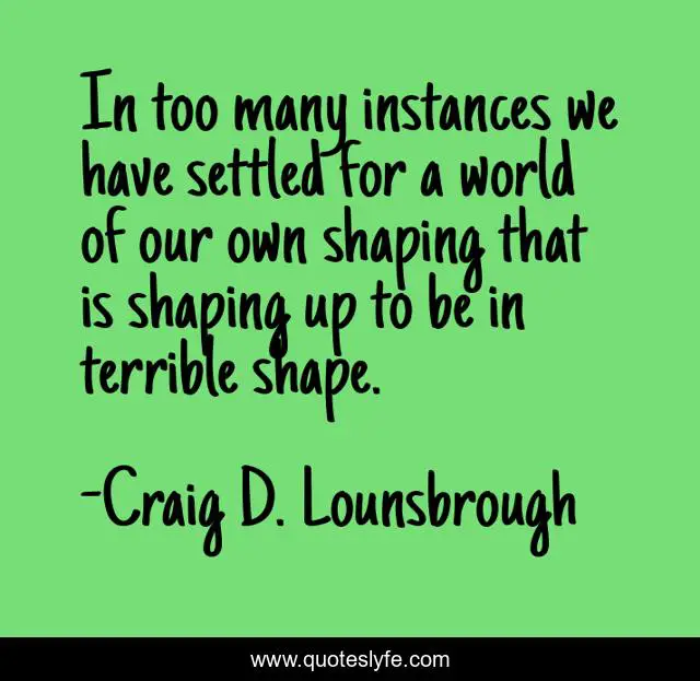 This page presents the quote "In too many instances we have settled for a world of our own shaping that is shaping up to be in terrible shape.". Author of this quote is Craig D. Lounsbrough. This quote is about living, life, choices-and-consequences, living-life, choices,.