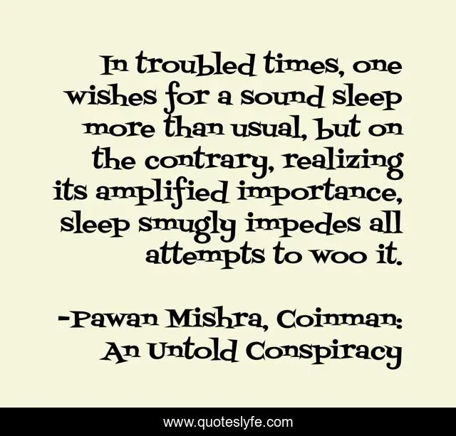 This page presents the quote "In troubled times, one wishes for a sound sleep more than usual, but on the contrary, realizing its amplified importance, sleep smugly impedes all attempts to woo it.". Author of this quote is Pawan Mishra, Coinman: An Untold Conspiracy. This quote is about troubled-times, sound-sleeper, personification, desperation, importance, troubles, sleeplessness, woo, sleep,.