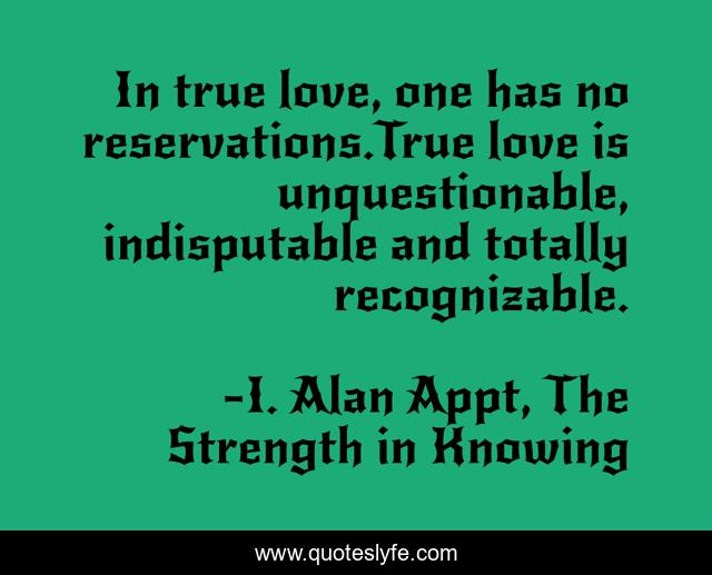 This page presents the quote "In true love, one has no reservations.True love is unquestionable, indisputable and totally recognizable.". Author of this quote is I. Alan Appt, The Strength in Knowing. This quote is about confidence, positive, motivational, philosophical, optimistic, psychological-guidance, self-help,.