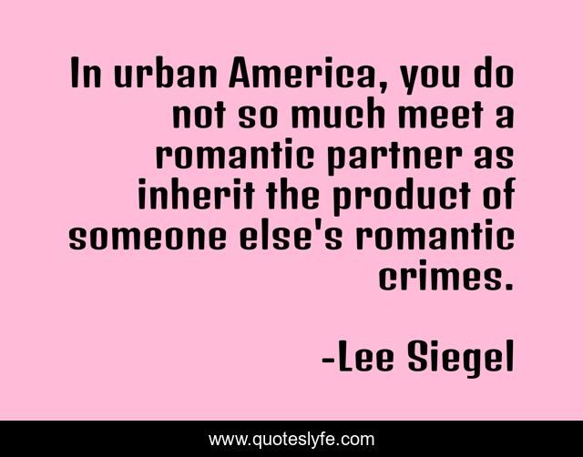 This page presents the quote "In urban America, you do not so much meet a romantic partner as inherit the product of someone else's romantic crimes.". Author of this quote is Lee Siegel. This quote is about partner, america,.