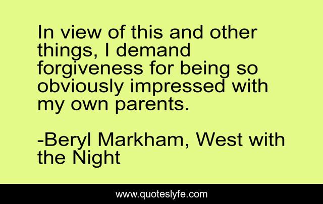 This page presents the quote "In view of this and other things, I demand forgiveness for being so obviously impressed with my own parents.". Author of this quote is Beryl Markham, West with the Night. .