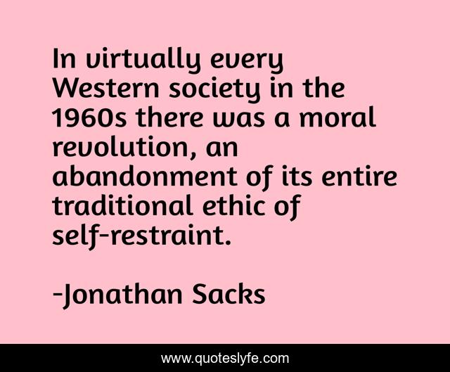 This page presents the quote "In virtually every Western society in the 1960s there was a moral revolution, an abandonment of its entire traditional ethic of self-restraint.". Author of this quote is Jonathan Sacks. This quote is about revolution, moral,.
